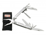Многофункциональный инструмент из нержавеющей стали. Функции: лезвие-пила, 1 крестовая, 2 шлицевые отвертки, кусачки с подпружиненной ручкой, большой и малый нож, кабельный резак, открывашки для банок и бутылок, штопор, линейка 20 см.