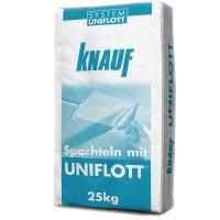 Шпаклёвка гипсовая высокопрочная KNAUF UNIFLOTT | КНАУФ Унифлот Гипсовая шпаклевка Унифлот Кнауф применяется для заделывания швов, стыков креплений листов и панелей из гипсокартона. Шпатлевка Унифлот Кнауф наносится на твердую поверхность, предварительно очищенную от пыли, и предназначена для работ в условиях температур не ниже + 10°С. Шпаклевание при помощи Кнауф Унифлот рекомендуется выполнять в два этапа: заполнив швы и дав раствору схватиться (до 30 минут), можно обработать выступы и мелкие неровности. Технические характеристики:Расход шпаклевки на 1 кв.м. для потолков 0,3 кг и перегородок 0,5 кгПропорции замеса на 1 л воды 2 кг смесиРаствор необходимо использовать в течение 1 часа после разведения Приготовления к работеПеред применением шпаклевки KNAUF UNIFLOTT рабочая поверхность подосновы должна быть твердой и прочной. Также необходимо предварительно зачистить поверхность от грязи и пыли. Если на рабочей подоснове имеется влага, то ее необходимо удалить.Подготовка раствораДля приготовления раствора потребуется 1 литр чистой воды и около 2 кг сухой смеси. Затем смесь и воду смешивают в емкости до состояния однородной густой массы. Смесь необходимо использовать в течении часа, так как после этого времени начинается застывание раствора. Порядок работыДля работы со шпаклевкой KNAUF UNIFLOTT температура воздуха в помещении должна быть не ниже + 10°С.Для работ рекомендуется использовать широкий шпатель с отверткой на рукоятке (ширина шпателя около 20 см.).Шпаклевание должно осуществляться в два прохода. Сначала необходимо заполнить швы и места установки шурупов раствором шпаклевки КНАУФ Унифлот, материал вдавливать в проемы шпателем.Затем раствору необходимо дать время прихватиться с поверхностью (около 30 минут) и после этого удалить все излишки смеси (выступы и т.д.).Мелкие неровности и выступы лучше всего обработать после полного затвердения смеси.Оставшийся и уже подсохнувший материал последующей переработке не подлежит.Инструменты и емкость для замешивания необходимо сразу вымыть водой, так как остатки засохнувшей смеси могут отрицательно сказаться на результате следующего замешивания.